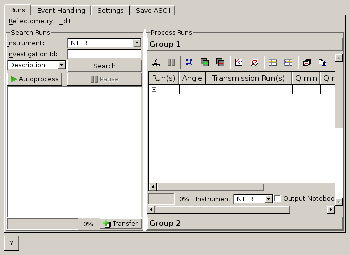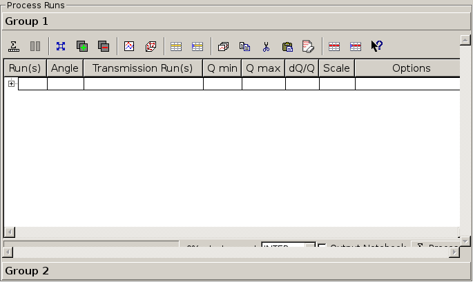 Tabs Runs, Event Handling and Settings contain a tool box with two different groups. These groups are useful when users need to apply different options to runs measured during the same experiment. For instance, if some runs need to be analyzed with a wavelength range of LambdaMin=1, LambdaMax=17 but others need a wavelength range of LambdaMin=1.5, LambdaMax=15, users may want to transfer the first set to the processing table in the first group and the second set to the processing table in the second group. The interface will use the settings in the first group to reduce runs in the first processing table, and the settings in the second group to reduce runs in the second processing table. The process is analogous for time slicing options specified in the Event Handling tab.