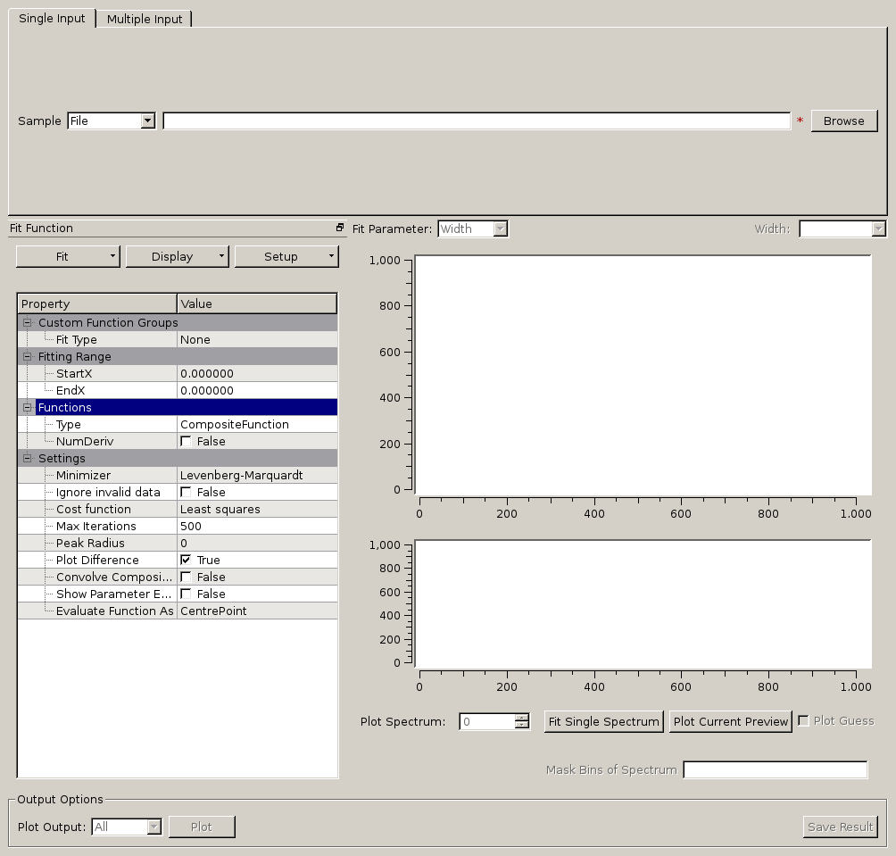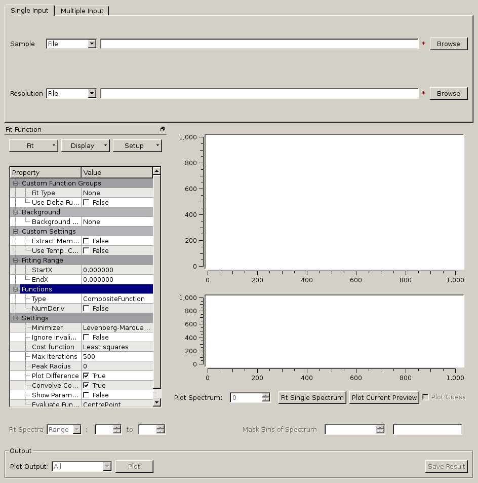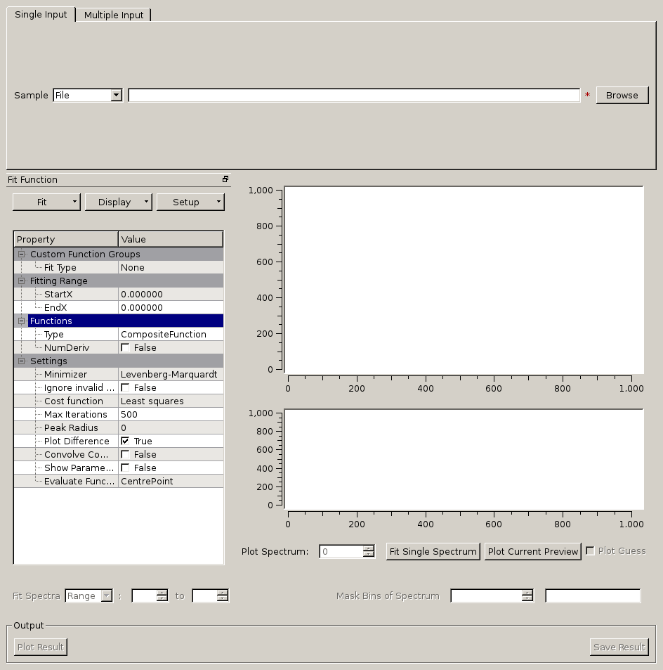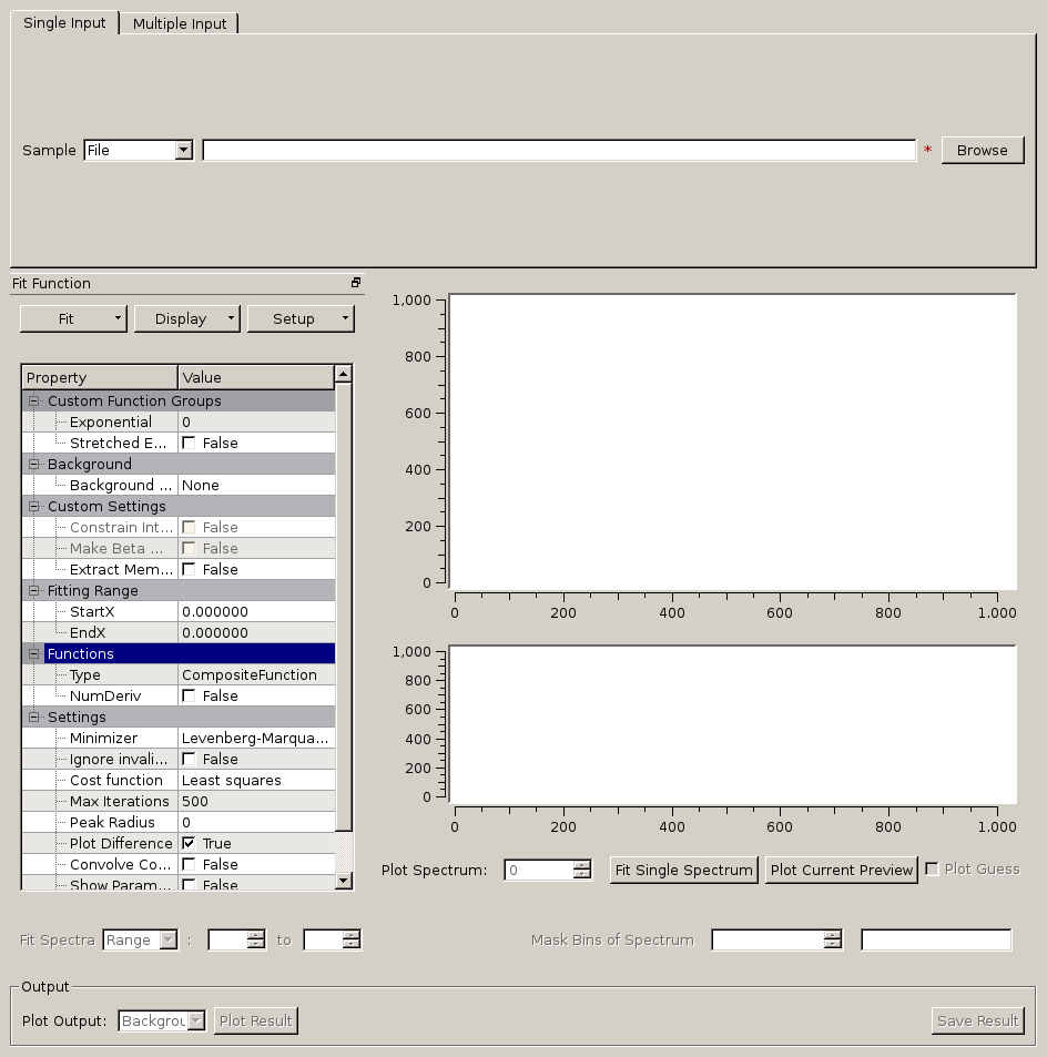 Each interface provides the option to choose between selecting one or multiple data files to be fit. The selected mode can be changed by clicking either the ‘Single Input’ tab or ‘Multiple Input’ tab at the the top of the interface to switch between selecting one or multiple data files respectively. Data may either be provided as a file, or selected from workspaces which have already been loaded.