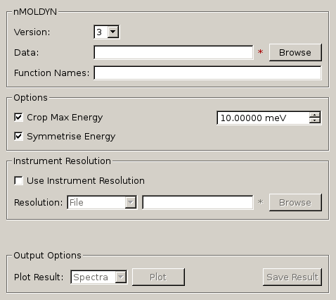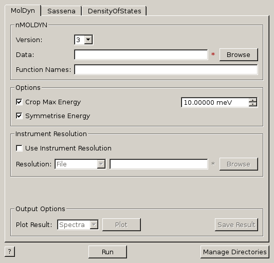 The MolDyn interface is used to import simulation data created using nMOLDYN (by using the MolDyn algorithm), tab operates on either .dat or .cdl files for nMOLDYN 3 or a directory containing the files extracted from the .tar archive crated by nMOLDYN 4.