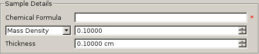 The sample details required are the chemical formula which is to be given in the format expected by the SetSampleMaterial algorithm, number density per atom in atoms/\mathrm{\AA{}}^3 and thickness in cm.