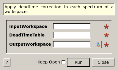 | DeadTimeTable | Input | TableWorkspace | Mandatory | Name of the Dead Time Table |