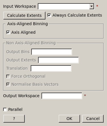 AxisAligned Input boolean True Perform binning aligned with the axes of the input MDEventWorkspace?