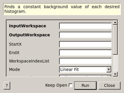 | WorkspaceIndexList | Input | int list | Indices of the spectra that will have their background removed default: modify all spectra | |