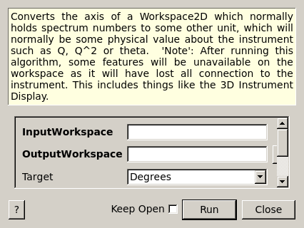 Converts the axis of a Workspace2D which normally holds spectrum numbers to some other unit, which will normally be some physical value about the instrument such as Q, Q^2 or theta. ‘Note’: After running this algorithm, some features will be unavailable on the workspace as it will have lost all connection to the instrument. This includes things like the 3D Instrument Display.