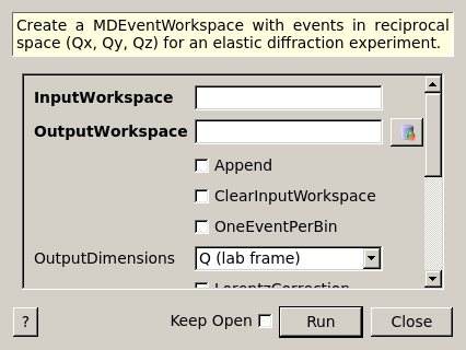 | OutputWorkspace | Output | MDEventWorkspace | Mandatory | Name of the output MDEventWorkspace. If the workspace already exists, then the events will be added to it. |