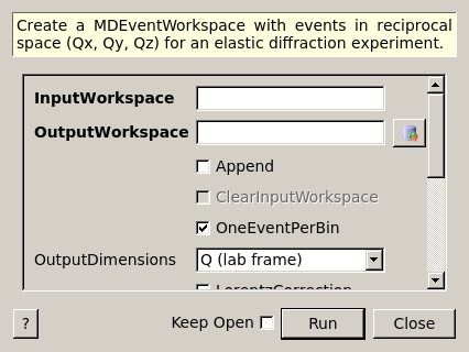 | OutputWorkspace | Output | MDEventWorkspace | Mandatory | Name of the output MDEventWorkspace. If the workspace already exists, then the events will be added to it. |