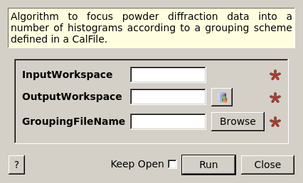 | OutputWorkspace | Output | MatrixWorkspace | Mandatory | The result of diffraction focussing of InputWorkspace |