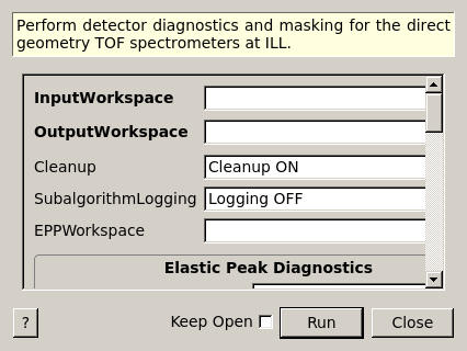 | ElasticPeakErrorThreshold | Input | number | Optional | To fail the elastic peak diagnostics, the intensity must also exceed this number of error bars with respect to the median intensity. |