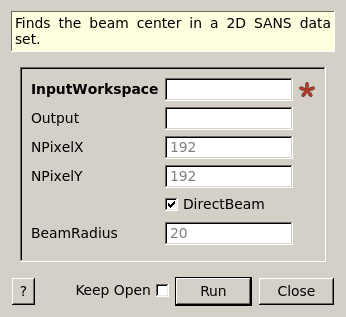 | DirectBeam | Input | boolean | True | If true, a direct beam calculation will be performed. Otherwise, the center of mass of the scattering data will be computed by excluding the beam area. |