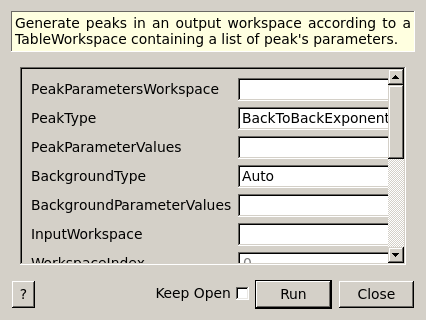 | PeakParametersWorkspace | Input | TableWorkspace | Input TableWorkspace for peak’s parameters. | |