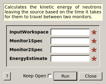 | EnergyEstimate | Input | number | Mandatory | An approximate value for the typical incident energy, energy of neutrons leaving the source (meV) |