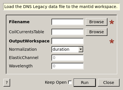 This algorithm loads a DNS legacy data file into a Workspace2D. The loader rotates the detector bank in the position given in the data file.