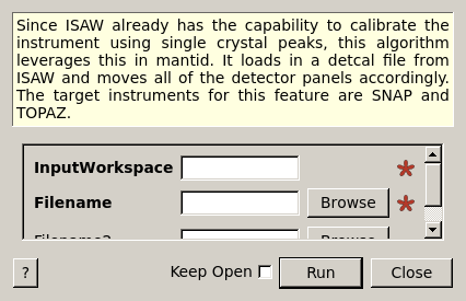 | Filename | Input | list of str lists | Mandatory | The input filename of the ISAW DetCal file (Two files allowed for SNAP) . Allowed extensions: [‘.detcal’, ‘.peaks’, ‘.integrate’] |