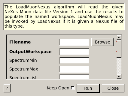 | Filename | Input | string | Mandatory | The name of the Nexus file to load. Allowed extensions: [‘.nxs’] |