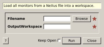 | OutputWorkspace | Output | Workspace | Mandatory | The name of the output workspace in which to load the NeXus monitors. |