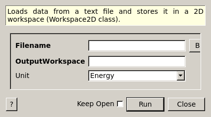 | OutputWorkspace | Output | MatrixWorkspace | Mandatory | The name of the workspace that will be created, filled with the read-in data and stored in the [[Analysis Data Service]]. |