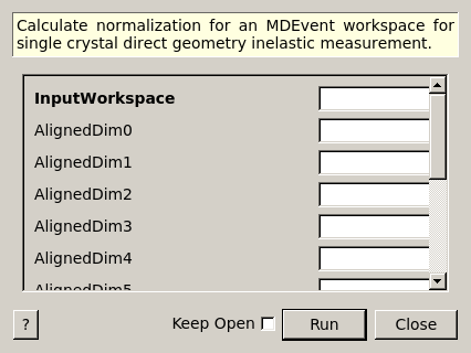 | TemporaryNormalizationWorkspace | Input | IMDHistoWorkspace | An input MDHistoWorkspace used to accumulate normalization from multiple MDEventWorkspaces. If unspecified a blank MDHistoWorkspace will be created. | |