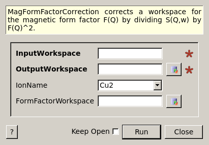 MagFormFactorCorrection corrects a workspace for the magnetic form factor F(Q) by dividing S(Q,w) by F(Q)^2.