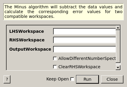 | RHSWorkspace | Input | MatrixWorkspace | Mandatory | The name of the input workspace on the right hand side of the operation |