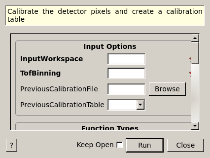 | CalibrationParameters | Input | string | DIFC | Select calibration parameters to fit. Allowed values: [‘DIFC’, ‘DIFC+TZERO’, ‘DIFC+TZERO+DIFA’] |