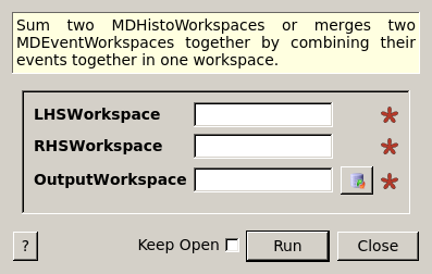 This algorithm sums two MDHistoWorkspaces or merges two MDEventWorkspaces together.