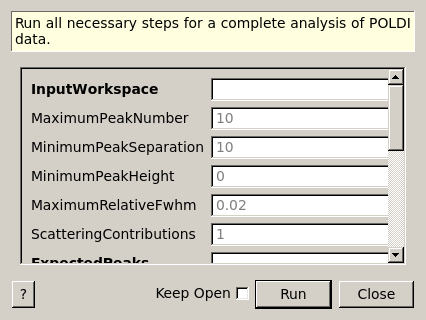 | InputWorkspace | Input | Workspace | Mandatory | MatrixWorkspace with 2D POLDI data and valid POLDI instrument. |