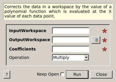 Corrects the data in a workspace by the value of a polynomial function which is evaluated at the X value of each data point.