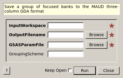 Takes a WorkspaceGroup whose children are single-spectra workspaces corresponding to focused banks, and saves them to the MAUD-readable .gda format.