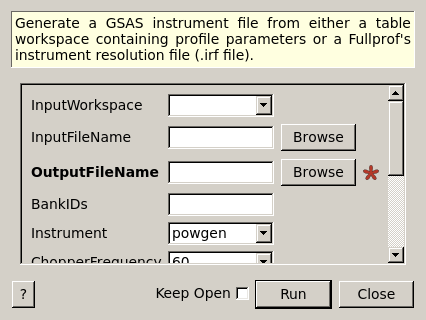 Generate a GSAS instrument file from either a table workspace containing profile parameters or a Fullprof’s instrument resolution file (.irf file).