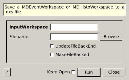 Save an MDEventWorkspace or a MDHistoWorkspace to a .nxs file. The workspace’s current box structure and entire list of events is preserved. The resulting file can be loaded via LoadMD.