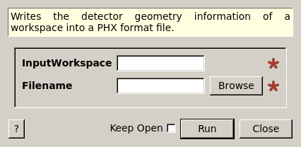Saves the geometry information of the detectors in a workspace into a PHX format ASCII file. The angular positions and angular sizes of the detectors are calculated using FindDetectorsPar v1 algorithm.