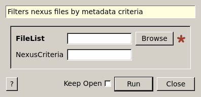 | NexusCriteria | Input | string | Logical expresion for metadata criteria using python syntax. Provide full absolute names for nexus entries enclosed with $ symbol from both sides. | |