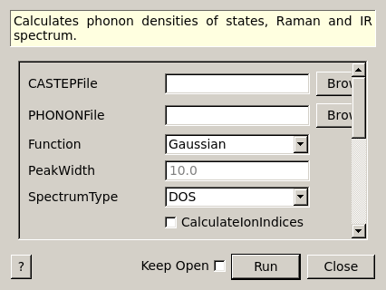 | SpectrumType | Input | string | DOS | Type of intensities to extract and model (fundamentals-only) from .phonon. Allowed values: [‘IonTable’, ‘DOS’, ‘IR_Active’, ‘Raman_Active’, ‘BondTable’] |