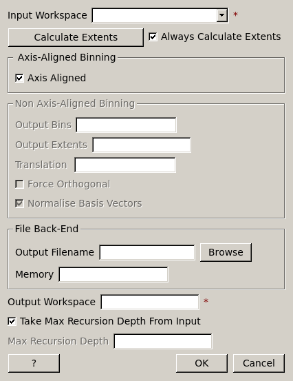 | AxisAligned | Input | boolean | True | Perform binning aligned with the axes of the input MDEventWorkspace? |