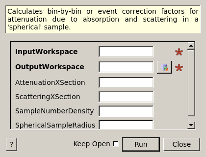 Calculates bin-by-bin or event correction factors for attenuation due to absorption and scattering in a spherical sample. Sample data should be divided by these corrections. Algorithm calls AnvredCorrection v1.