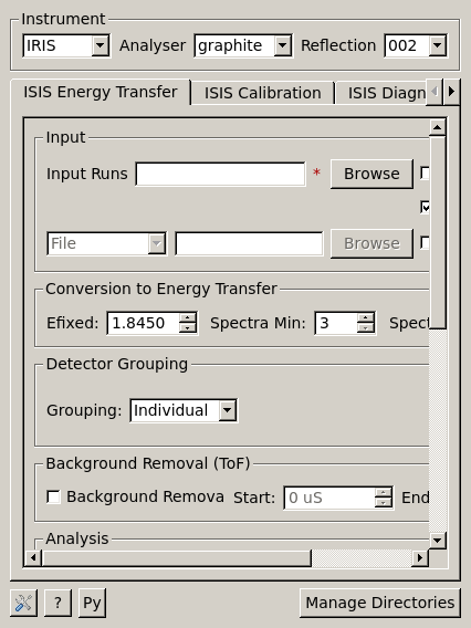 ).The ISIS Energy Transfer tab operates on raw TOF data files. Before starting this workflow, go to Manage Directories and make sure that Search Data Archive is set to all.