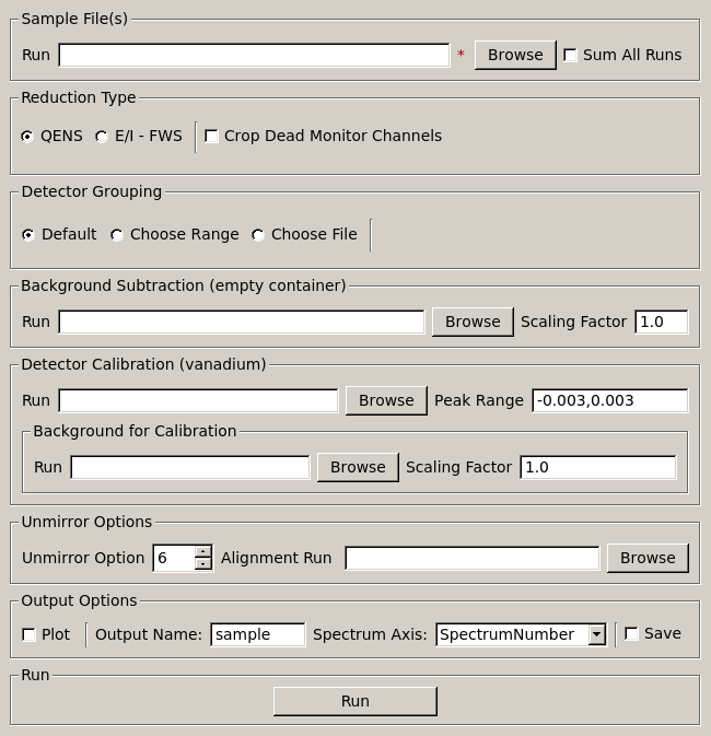 The Indirect Data Reduction interface provides the initial reduction that is used to convert raw instrument data to S(Q, w) for analysis in the Indirect Data Analysis and Indirect Bayes interfaces.