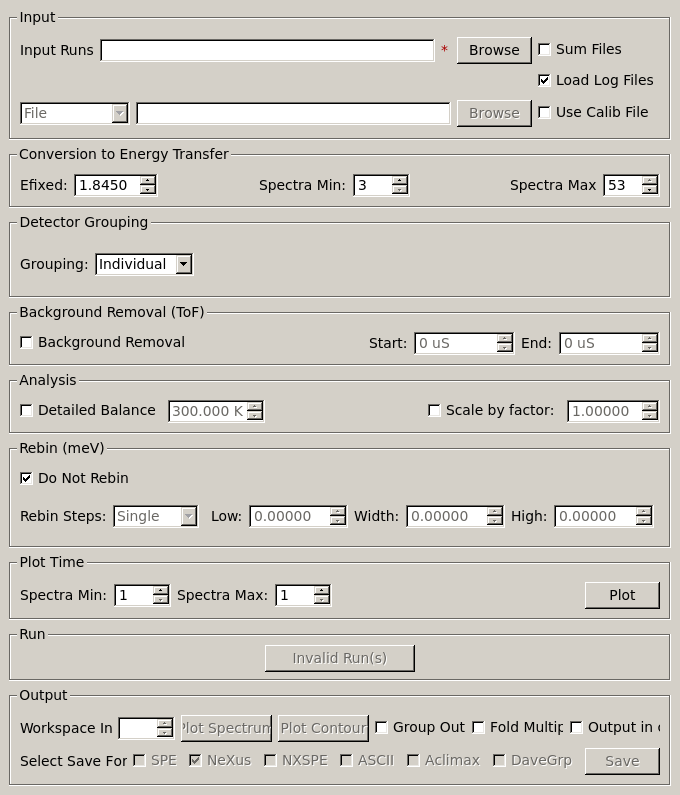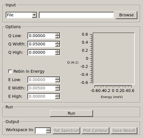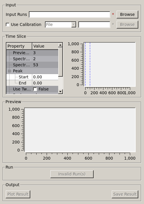 This tab allows you to perform an integration on a raw file over a specified time of flight range, and is equivalent to the Slice functionality found in MODES. It is only available when the default facility is set to ISIS.