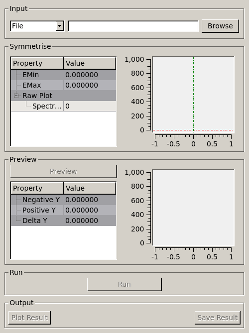 .The Symmetrise tab operates on _red files. The file used in this workflow can be produced using the 26176 run number on the ISIS Energy Transfer tab. The instrument used to produce this file is IRIS, the analyser is graphite and the reflection is 002. See the ISIS Energy Transfer Example Workflow.