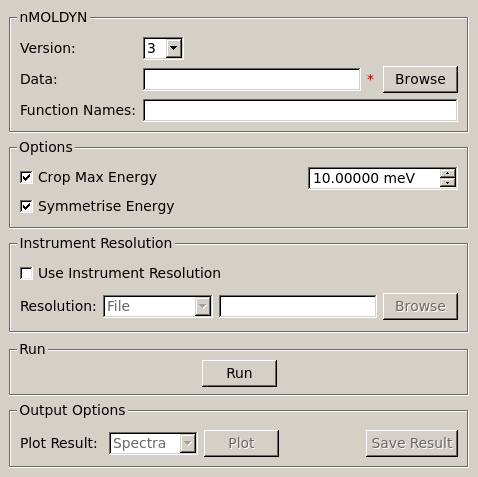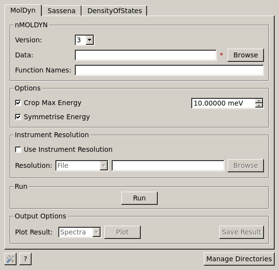 The MolDyn interface is used to import simulation data created using nMOLDYN (by using the MolDyn algorithm), tab operates on either .dat or .cdl files for nMOLDYN 3 or a directory containing the files extracted from the .tar archive created by nMOLDYN 4.