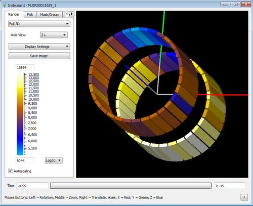 The display window show the instrument detector coloured according to the integrated counts in a workspace. The integration range is adjusted using the data integration slider.