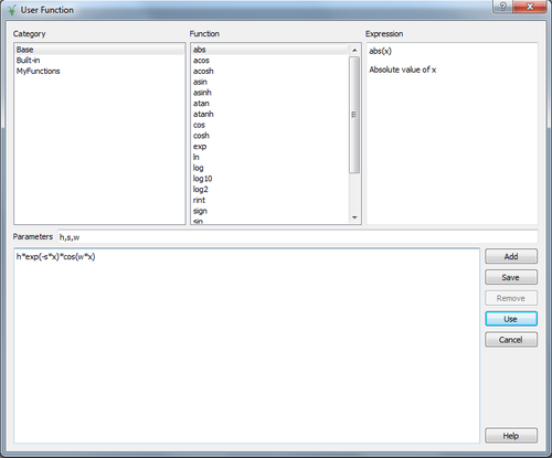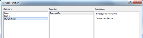 The formula can either be entered in the text editor in the Fit Function browser or constructed with the help of the User Function Dialog.