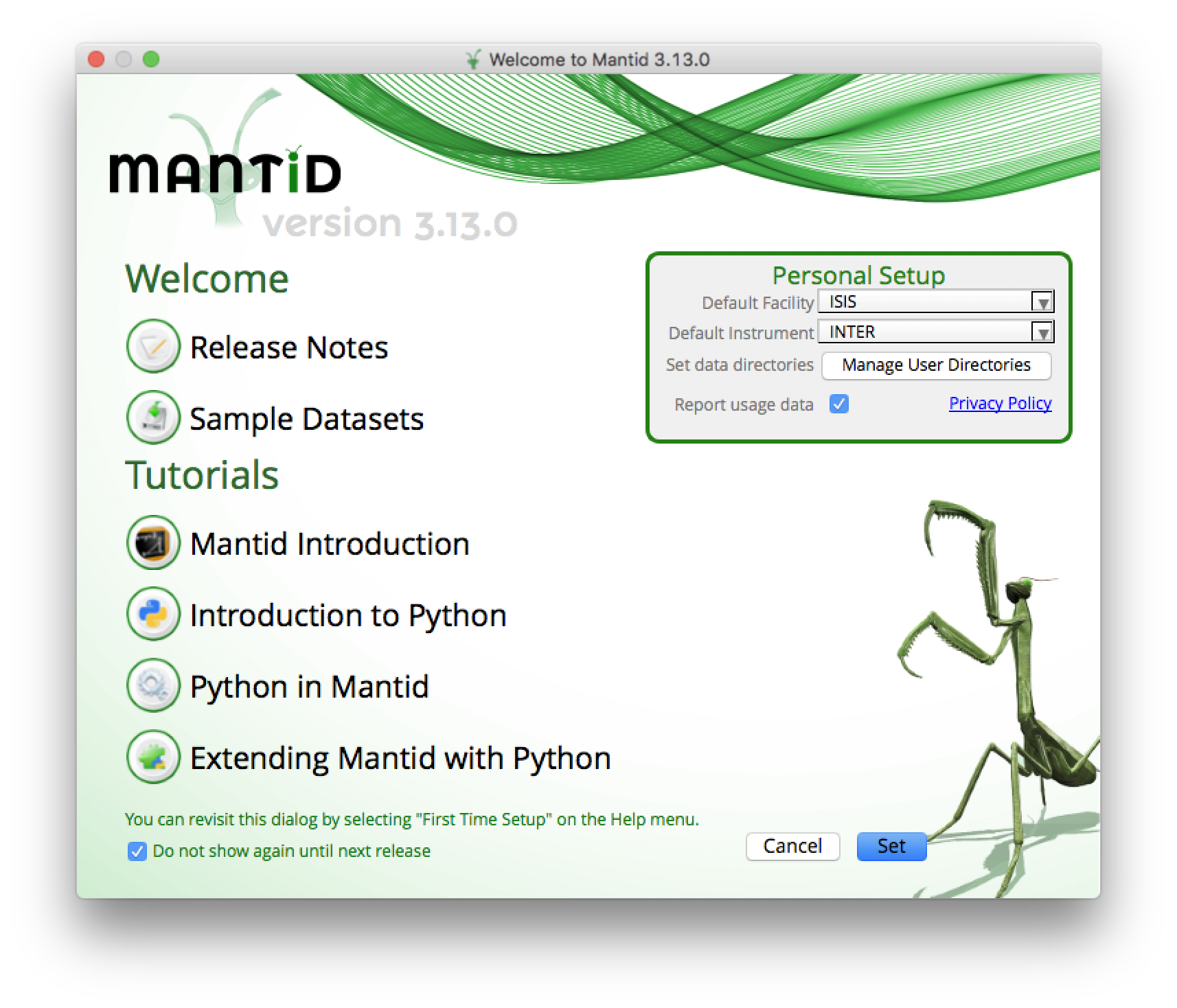If you do not want to see this screen every time you start Mantid, you can check the “Do not show again until next release” box. You can re-access this screen from the main MantidPlot GUI at any time by going to “Help > First Time Setup”.