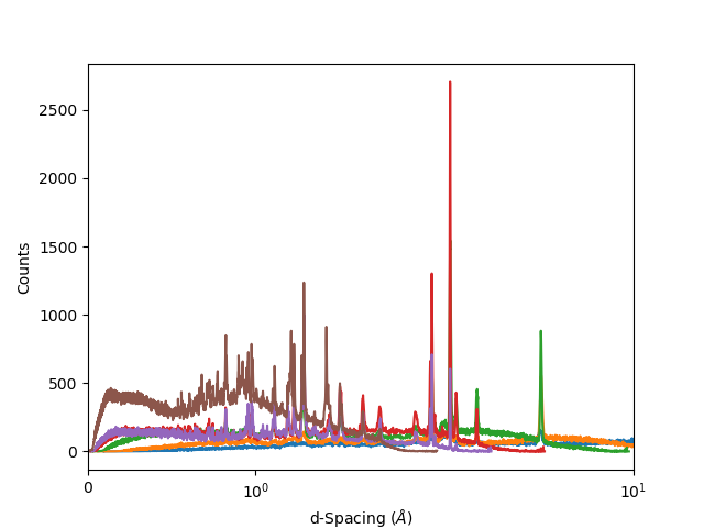 change the d-spacing axis range to 0-10 angstroms and set the x-axis to a logarithmic scale