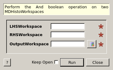 | LHSWorkspace | Input | IMDWorkspace | Mandatory | An MDEventWorkspace, MDHistoWorkspace or WorkspaceSingleValue as the left-hand side of the operation. |