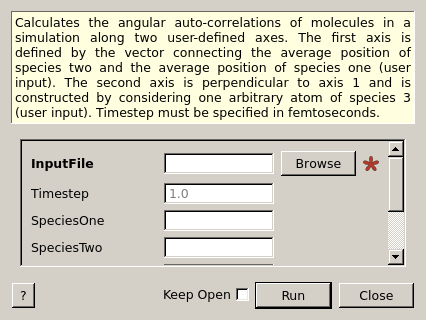 Calculates the angular auto-correlations of molecules in a simulation along two user-defined axes. The first axis is defined by the vector connecting the average position of species two and the average position of species one (user input). The second axis is perpendicular to axis 1 and is constructed by considering one arbitrary atom of species 3 (user input). Timestep must be specified in femtoseconds.