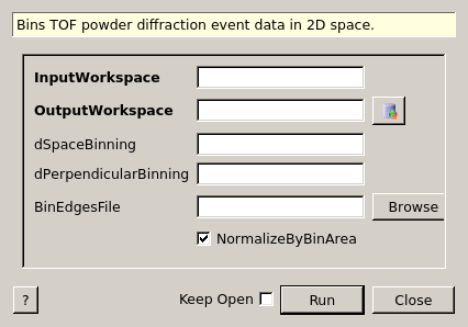 Either dSpaceBinning and dPerpendicularBinning or BinEdgesFile must be specified, but not both. dSpaceBinning contains binning parameters in d-Spacing. dPerpendicularBinning contains binning parameters in d-SpacingPerpendicular. Binning parameters should be set the same way as for Rebin v1 algorithm.
