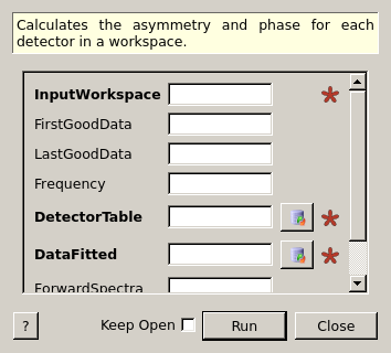 | DetectorTable | Output | TableWorkspace | Mandatory | Name of the TableWorkspace in which to store the list of phases and asymmetries |