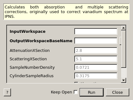 | Absorption | Input | boolean | True | If True then calculates the absorption correction. |