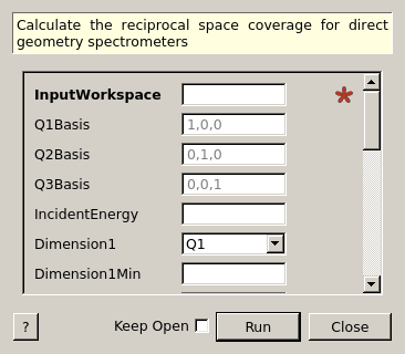 DimensionI, where I is from 1 to 4, allows one to select in which order Q1, Q2, Q3, DeltaE are stored in the output workspace. The algorithm will complain if you select the same dimension twice. For each dimension one can define minimum, maximum, and step size. If no minimum/maximum are set for DeltaE, these are chosen to be +/-Ei. If not specified, minimum/maximum for the Q dimensions are calculated based on the instrument geometry, incident energy, minimum/maximum for DeltaE, and lattice parameters.